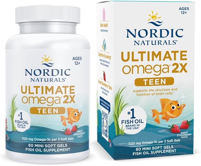 Nordic Naturals Ultimate Omega 2X Teen, Strawberry - 60 Mini Soft Gels - 1120 mg Total Omega-3s with EPA & DHA - Brain Health, Positive Mood, Social Development, Learning - Non-GMO - 30 Servings